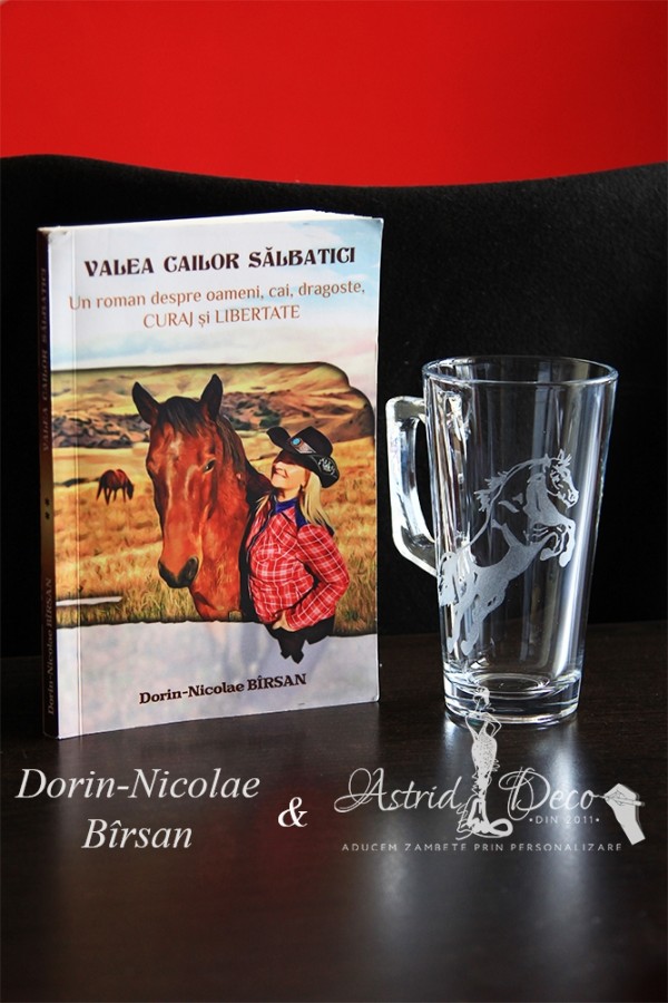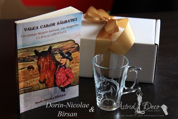 3) Roman + cană termorezistentă (250ml) din sticlă gravată manual cu model cal – 👉 click aici pentru pachetul 3