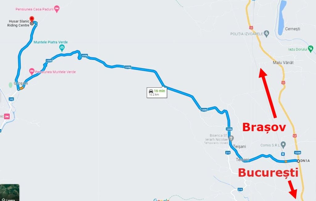 Pentru a ajunge la locație, vă recomandăm să părăsiți DN1A către direcția Teișani. Însă mare atenție dacă veniți dinspre Brașov, GPS-ul vă poate recomanda variante care nu sunt prea practicabile. Noi am avut neplăcerea să ajungem pe o altă rută unde drumul nu era întreținut. Pe ruta normală, după ce părăsiți DN1A, faceți aproximativ un sfert de oră până la locație.