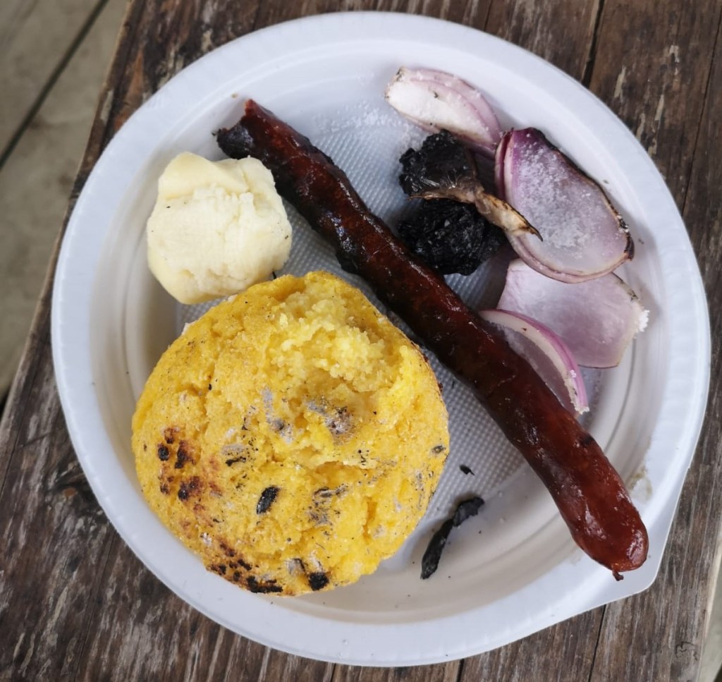 Fiind călare pe cai de ceva vreme, un moment pe care îl așteptam cu nerăbdare a fost masa de la prânz. Într-o vale în care se coboară pe o pantă domoală, călăreții sunt așteptați cu un bulz proaspăt de toată minunea, cu cârnați savuroși, brânză de burduf și alte elemente gastronomice pe care le-am înfulecat cu multă poftă.