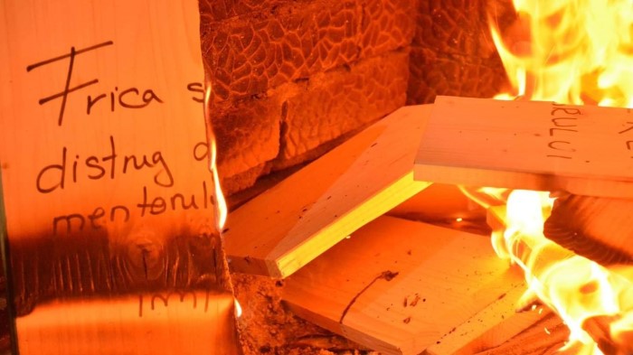 - Board breaking- Vom scrie fricile noastre pe o placa de lemn ( 30X 30 cm grosime aprox 2 cm ) și ulterior vom sparge acea placă de lemn cu podul palmei apoi vom face un foc cu bucățile sparte.