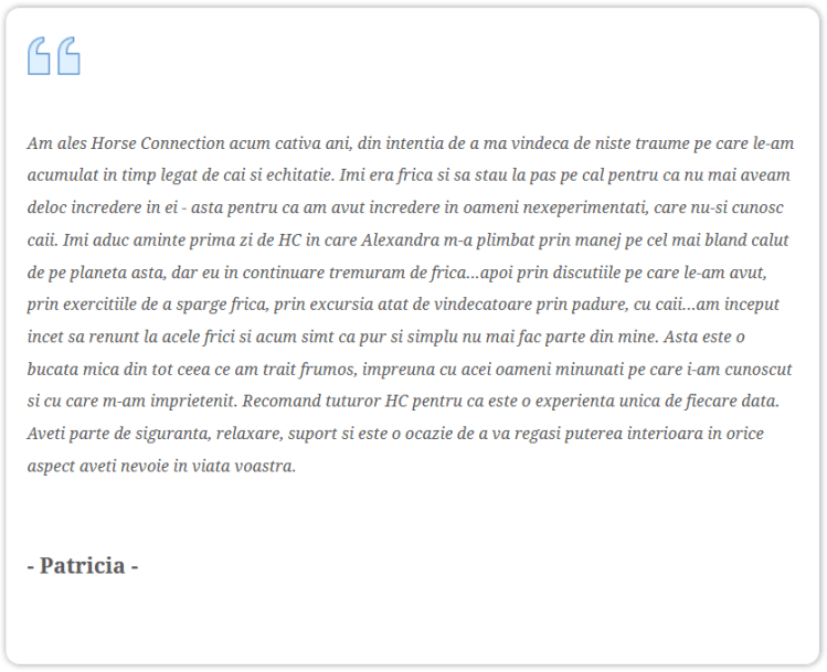 - Participanţii vor învăţa să ofere şi să primească feedback real și instant din partea calului cât și din partea trainerului și a celorlalți participanti.