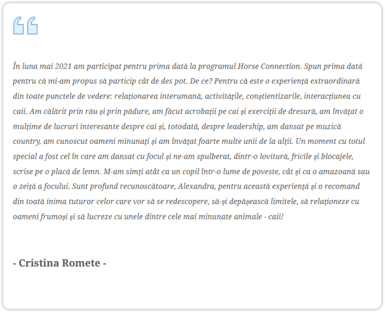 Îmi place să spun despre mine că ajut oamenii să se descopere pe ei, să stabilească conexiuni mai presus decat wi-fi, să privească natura printre urechile calului și să înțeleagă mai bine sufletul unui animal atât de frumos.